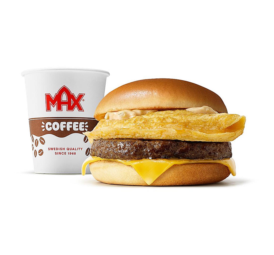 Burger wołowy z omletem, serem Cheddar, z dodatkiem sosu Oryginalnego w klasycznej, opieczonej na złoto bułce. W zestawie z małą kawą.