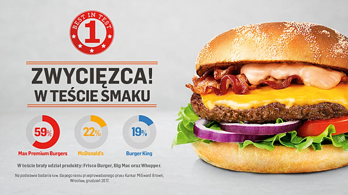 Badanie zostało zrealizowane na próbie 153 konsumentów we Wrocławiu, kobiet i mężczyzn w wieku 18+, w grudniu 2017, metodą ślepego testu smaku. Respondentom w neutralnych warunkach serwowane były trzy burgery w losowej kolejności, a wśród nich Frisco z MAX Premium Burgers, Big Mac z McDonald’s (22% głosów) oraz Whopper z Burger King (19% głosów). Następnie respondentów proszono o wybór ich zdaniem najlepszego.