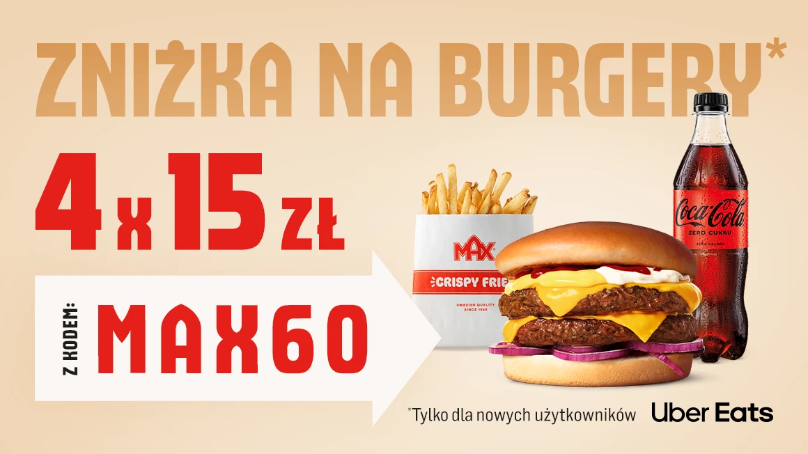 Promocja obowiązuje do 30.06.2024 r. i jest skierowana wyłącznie do nowych użytkowników Uber Eats. Promocja jest ważna na cztery pierwsze zamówienia ze zniżką 15 zł, każde złożone w Max Premium Burgers. Aby skorzystać z promocji użytkownik musi złożyć cztery pierwsze zamówienia w restauracji lub sklepie biorącym udział w promocji. Minimalna wartość zamówionych pozycji to 40 zł na jedno zamówienie. Promocja obejmuje tylko wartość produktów w koszyku, opłata za dostawę oraz pozostałe opłaty nadal obowiązują. Z promocji wyłączone są zamówienia z odbiorem osobistym. Oferta nie łączy się z innymi ofertami.